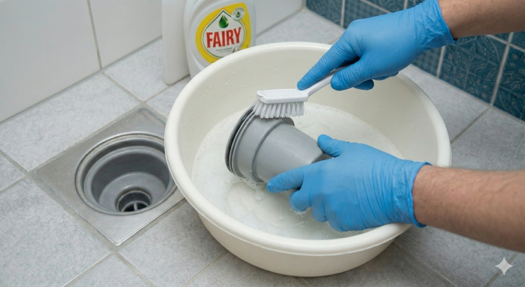 Tämä on se vaihe, jossa moni sulkee silmänsä. Kerää käsin (hanskat kädessä!) suurin osa hiuksista ja muusta irtoliasta pois. Laita ne suoraan roskapussiin. Älä yritä huuhdella näitä alas viemäristä, sillä ne vain siirtävät ongelman syvemmälle putkistoon.